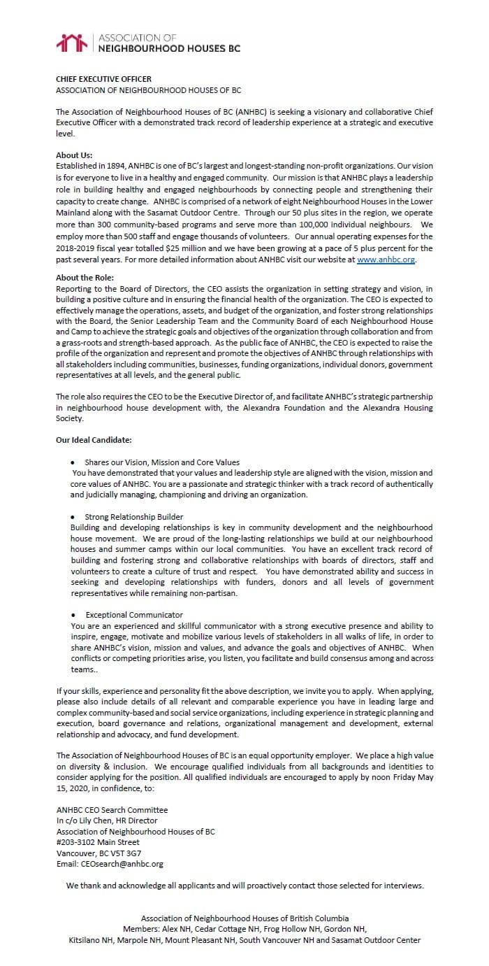 Mount Pleasant Neighbourhood House Executive Director (Closes October 11, 2019) South Vancouver Neighbourhood House: Family Support & Chinese Settlement (Closes September 20, 2019)