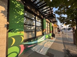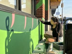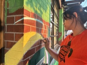 For artist Aleia and the staff members helping to paint it, the act of painting was also grounding. “When painting the mural I feel like I’m part of the process to create something bigger than myself, leaving behind part of me that intertwines with South Vancouver Neighbourhood House’s history and legacy,” says Cherry Wong, Community Engagement Programmer.