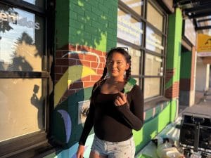 The artist who would bring this vision to life, Aleia Johnny, arrived in a way that felt almost fated. “My Grandma Thelma Stogan was hosting an Indigenous workshop at South Vancouver Neighbourhood House in early 2025,” Aleia remembers. “Mara Cortez, (Community Engagement Programmer with Reframing South Vancouver and local muralist) was present at the workshop when my Grandma started talking about my recent journey into Native Art. Mara asked to see my artwork and projects and from there we grew a friendship which led to my participation in the mural project.”